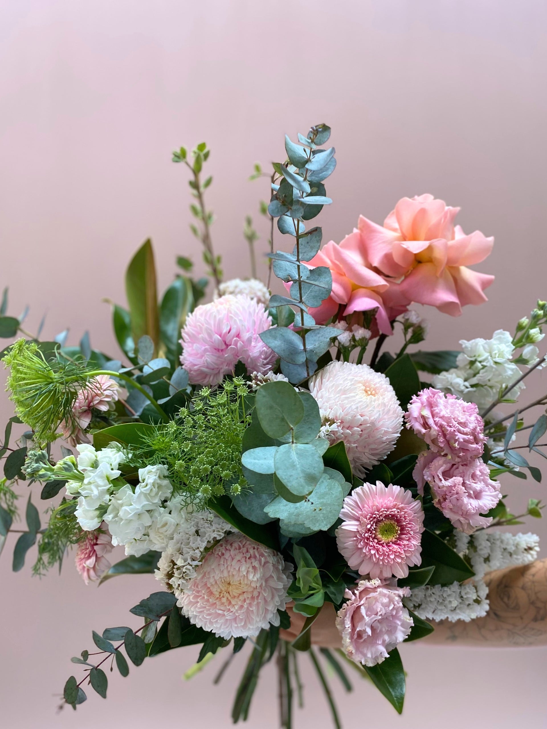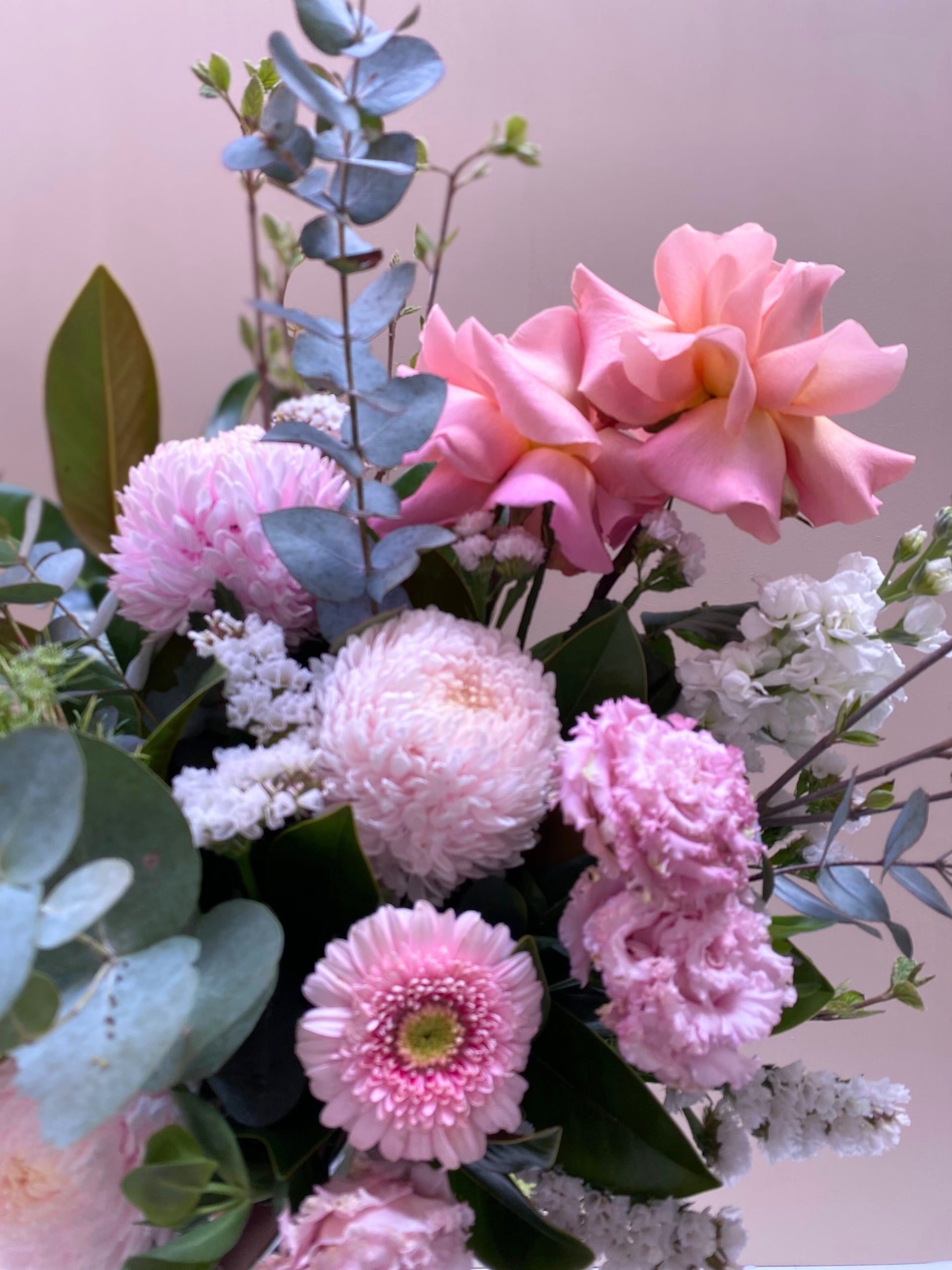 A blend of soft cottage blooms in gentle pinks and pastels, softened with lush garden greens. Romantic and charming, a floral reflection of Bloomsbury Way