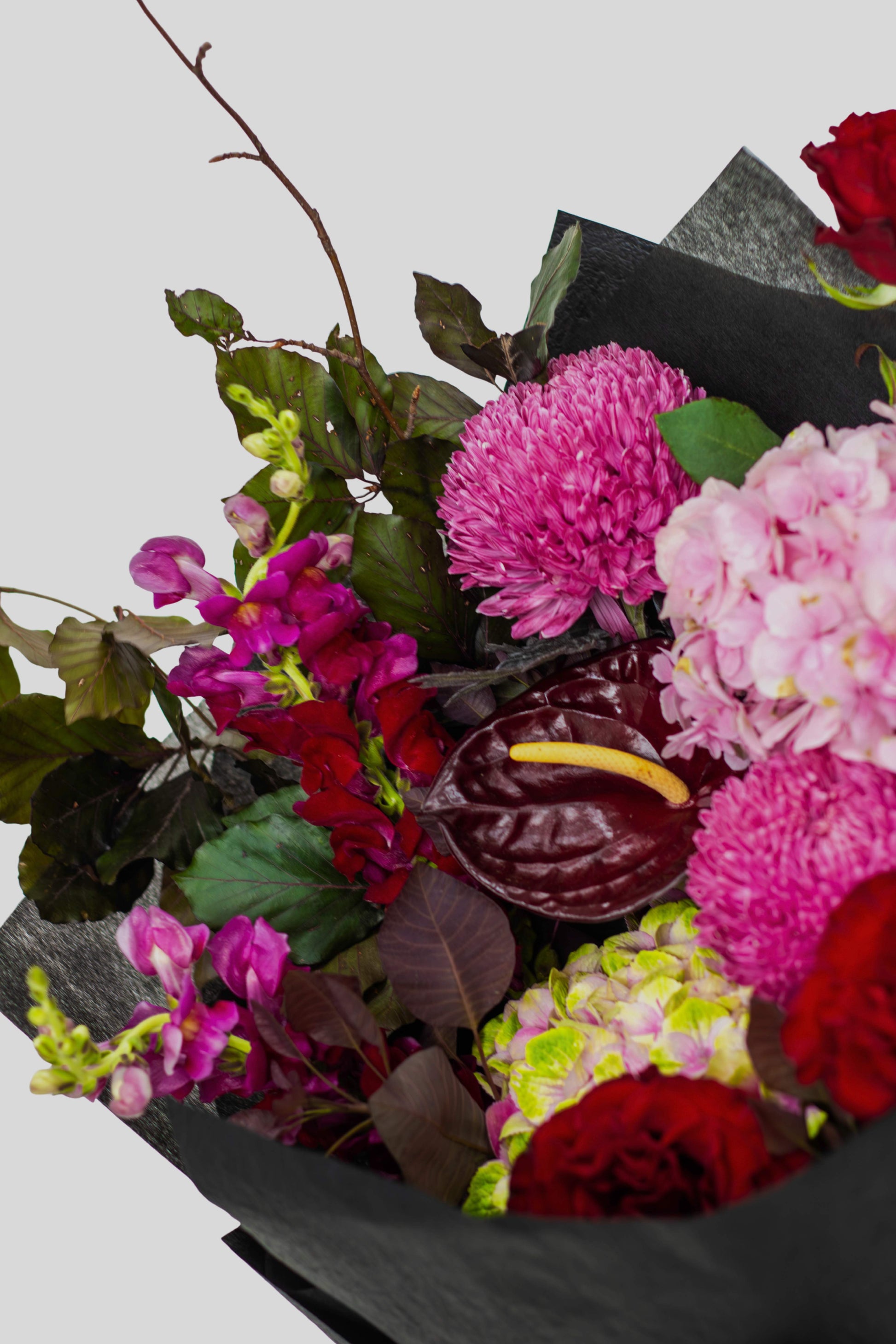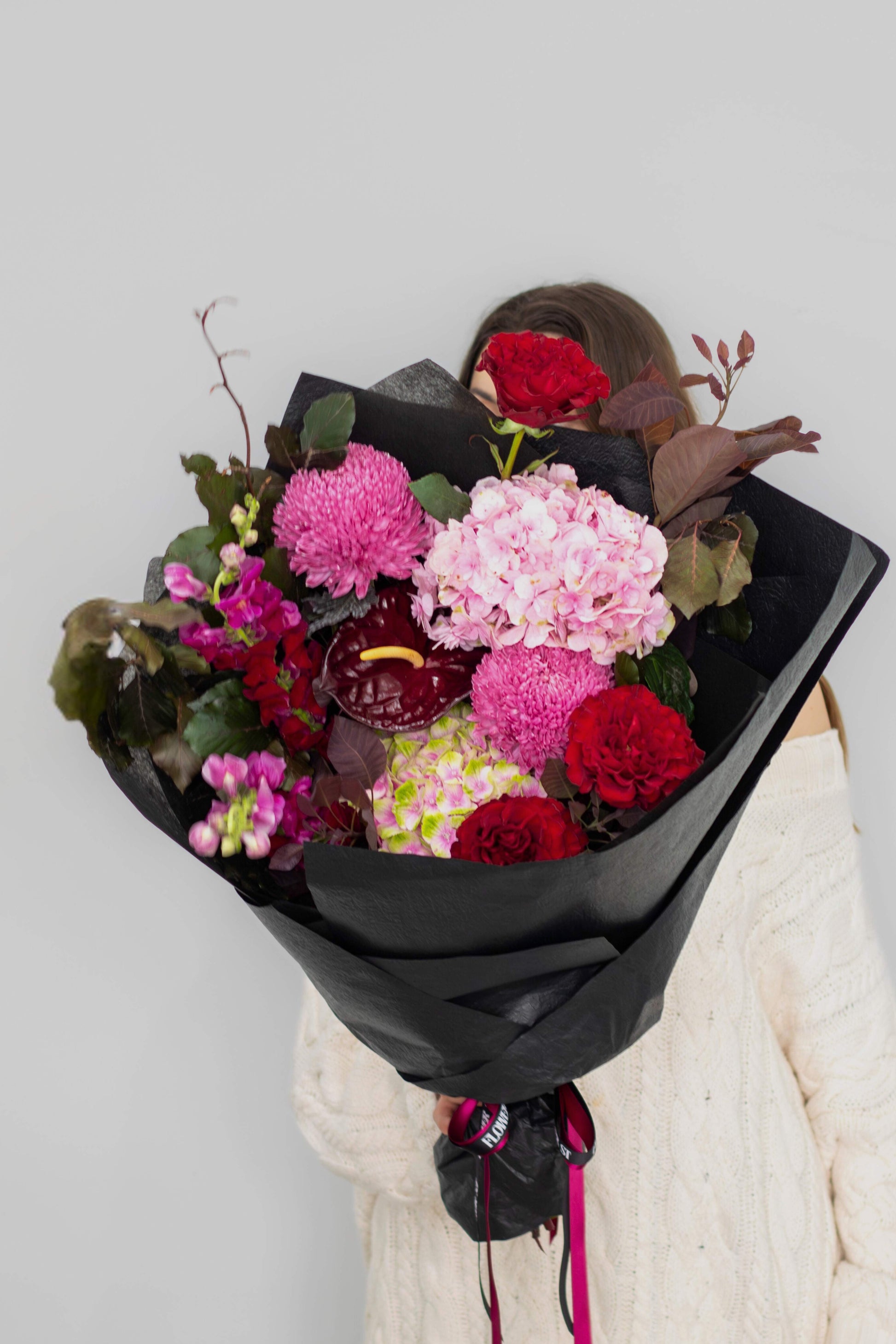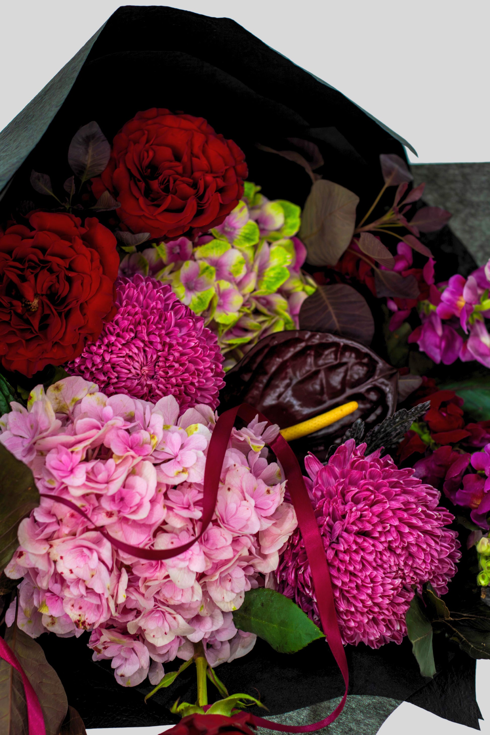 Burgundy and deep pink florals with red roses, hydrangea and anthuriums. Wrapped in luxe black, with our signature Flower St Ribbon.