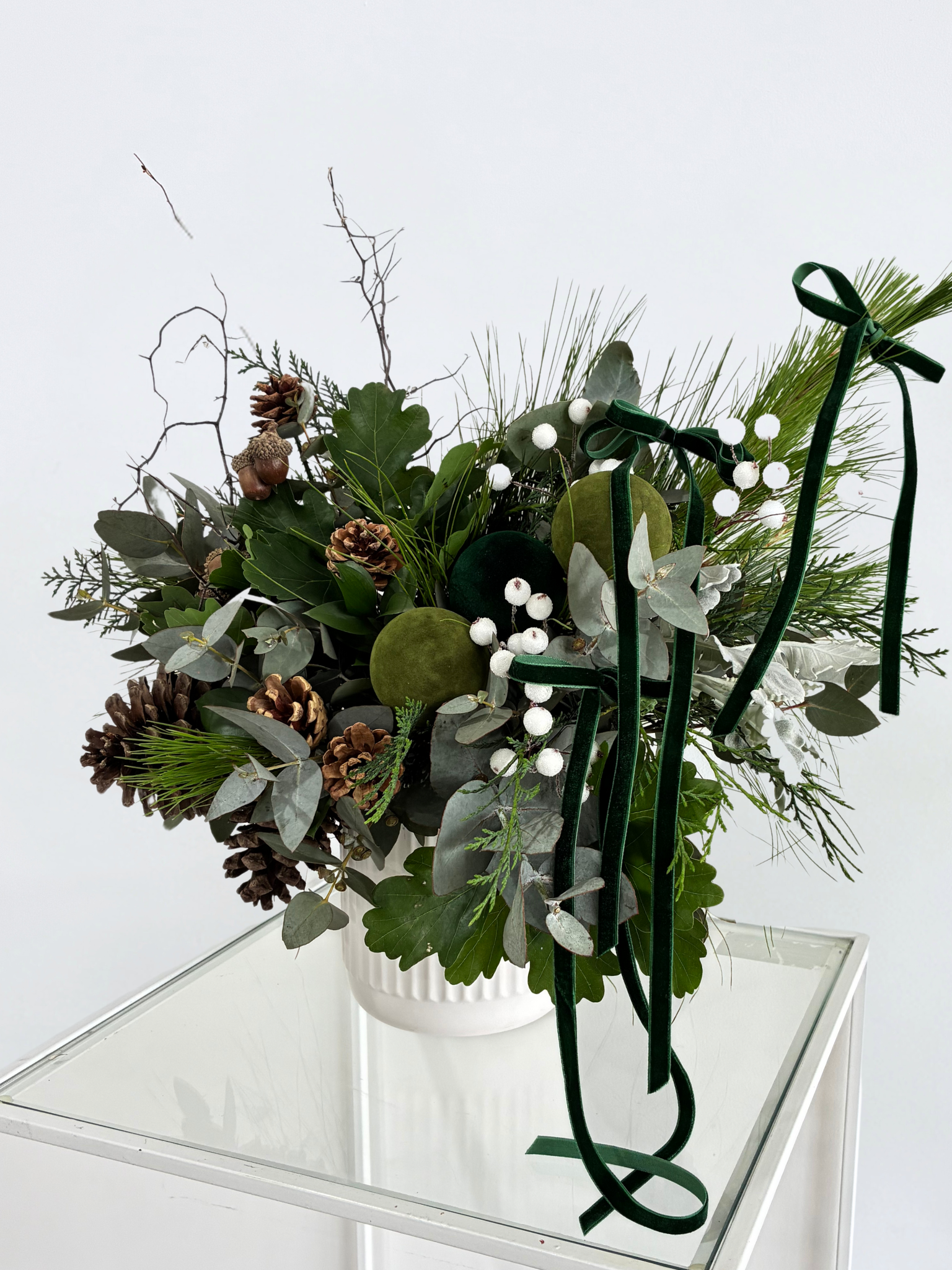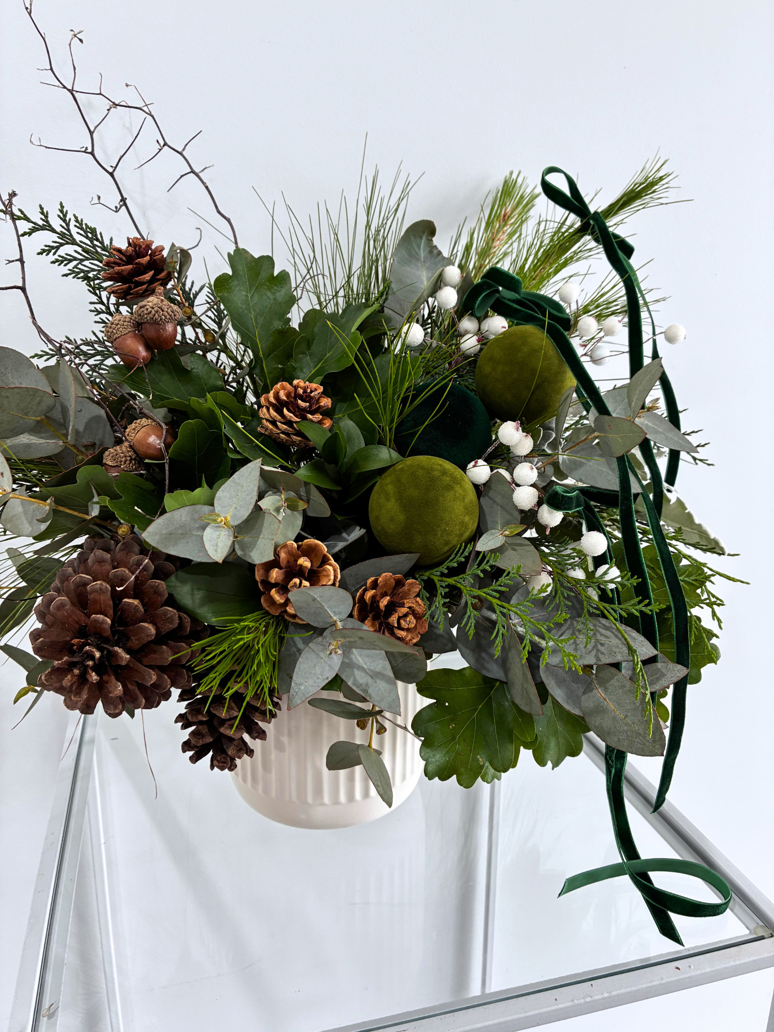 A serene blend of sage greens, crisp whites, and warm earthy tones, filled with gum and festive foliage. Presented in a white ceramic pot, Evergreen Rd is ready to gift or grace your Christmas table — understated, elegant, and effortlessly timeless.