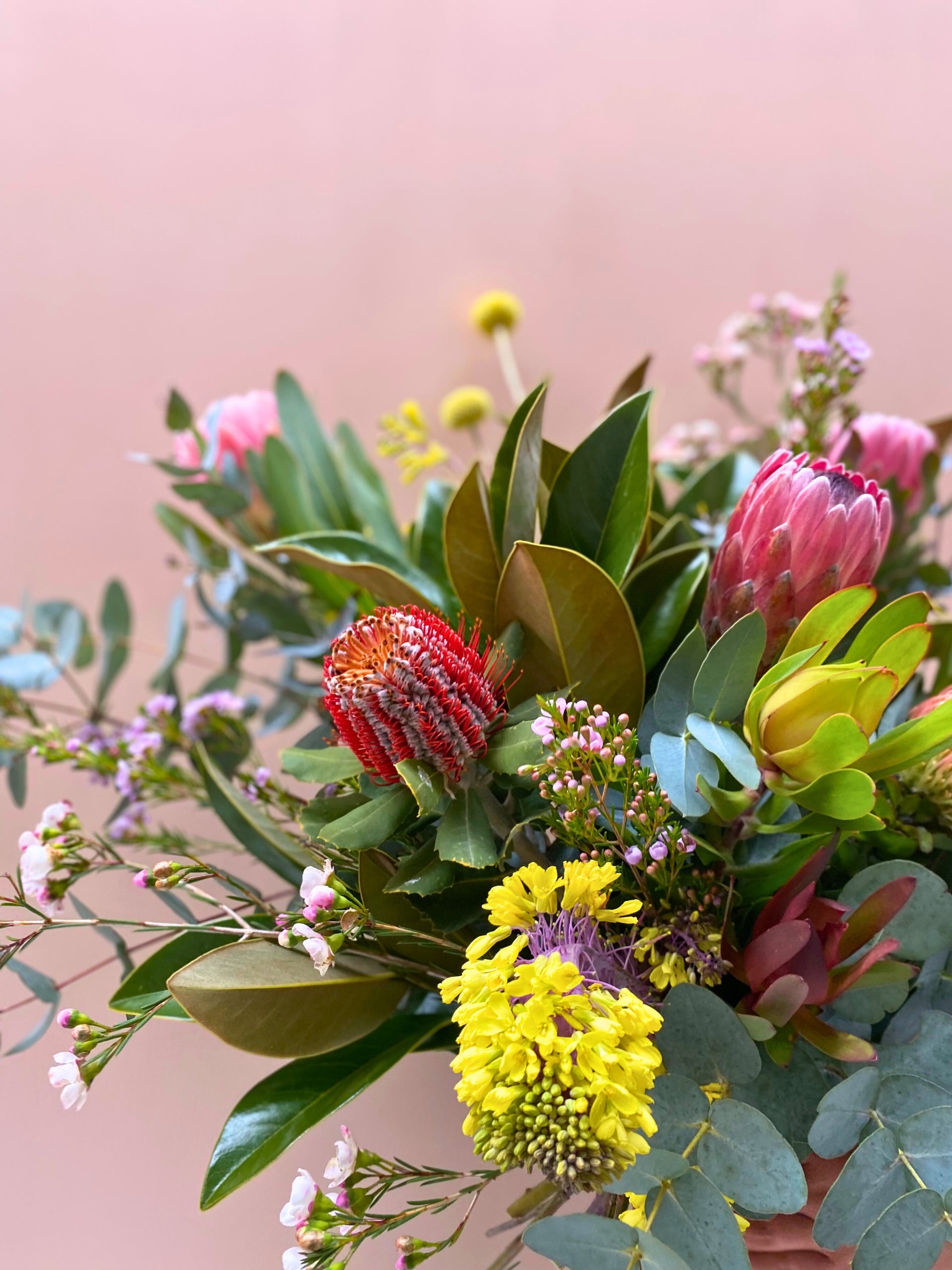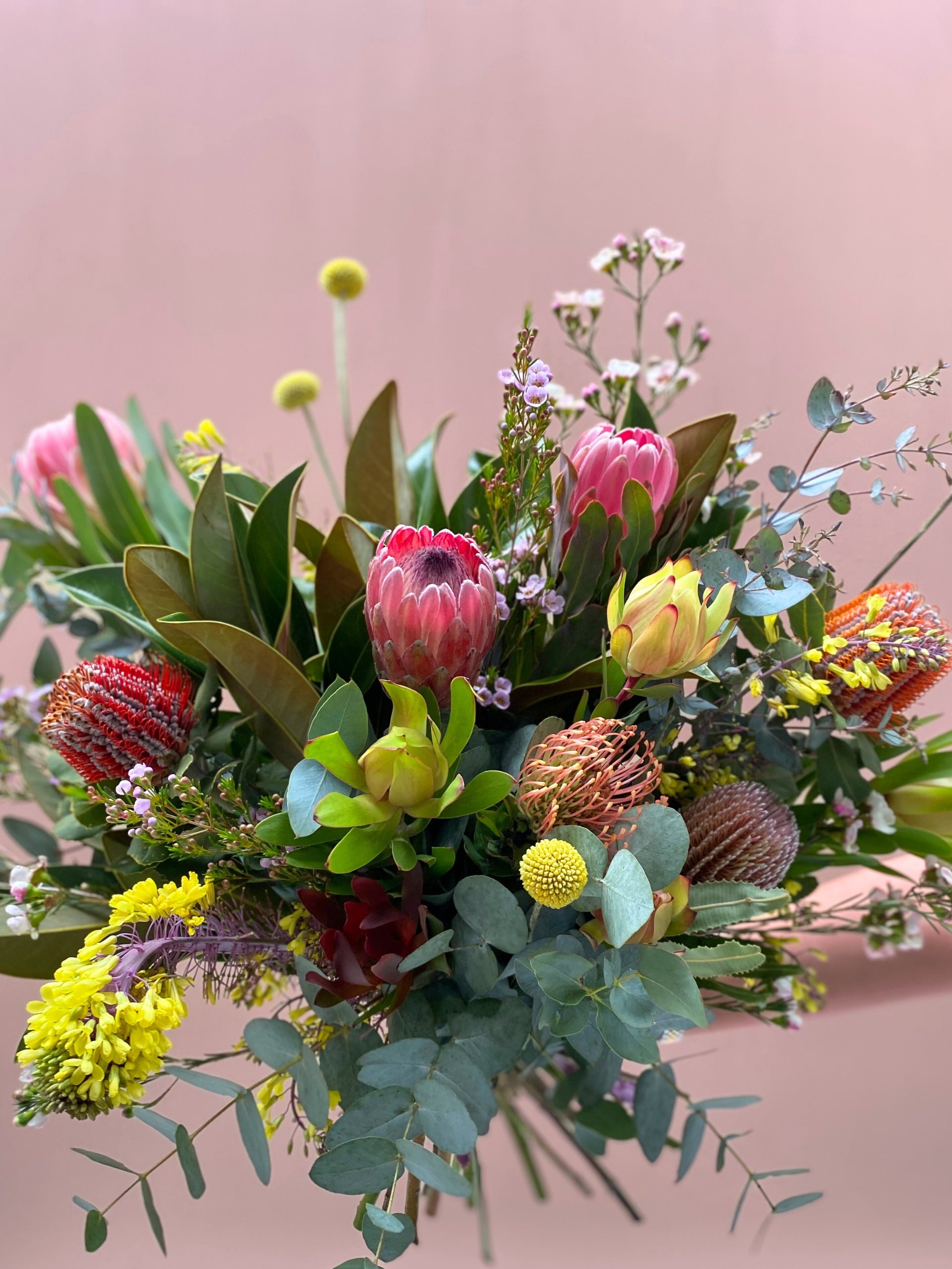 A rich blend of seasonal native flowers with wild texture and earthy tones. Raw and artistic, echoing Melbourne’s Flinders Lane.
