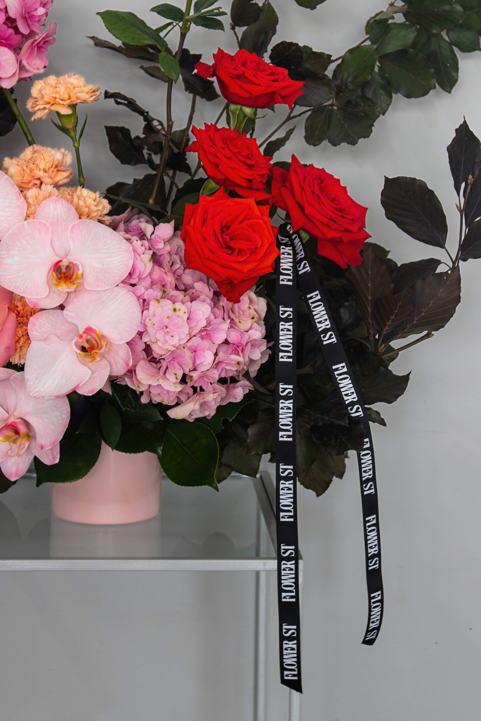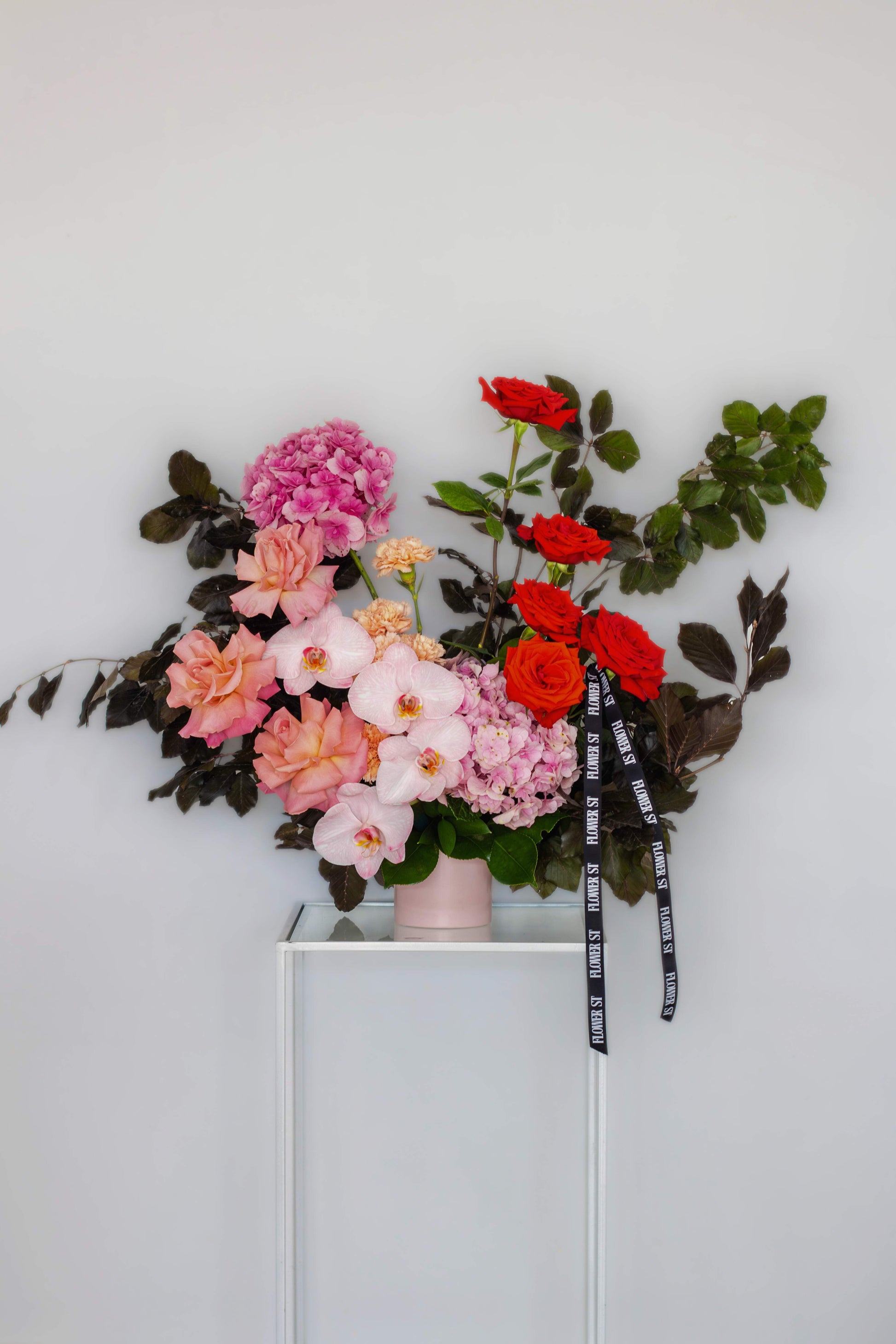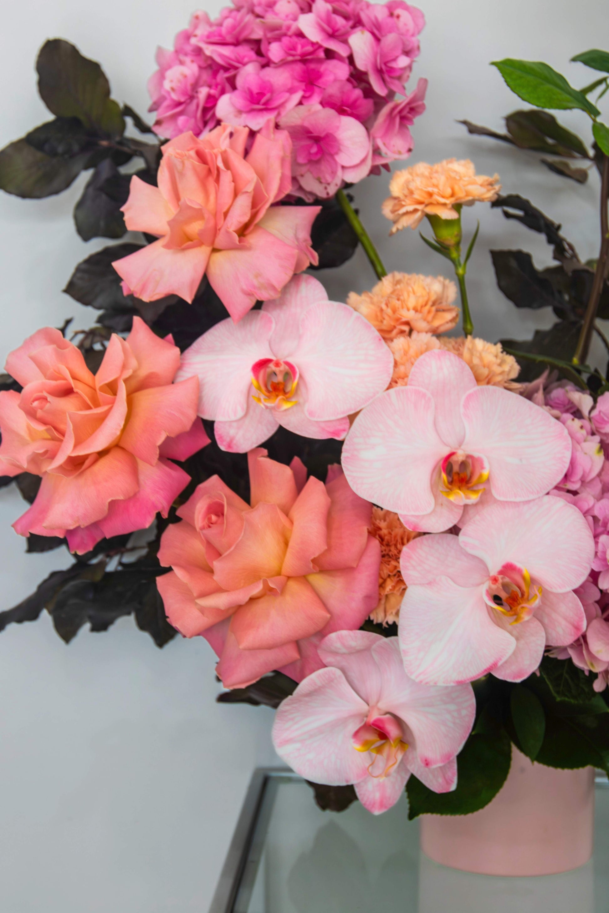 Phalaenopsis orchids, reflexed Hermosa and Nina roses, and hydrangea. Bold. Decadent. Obsessive.