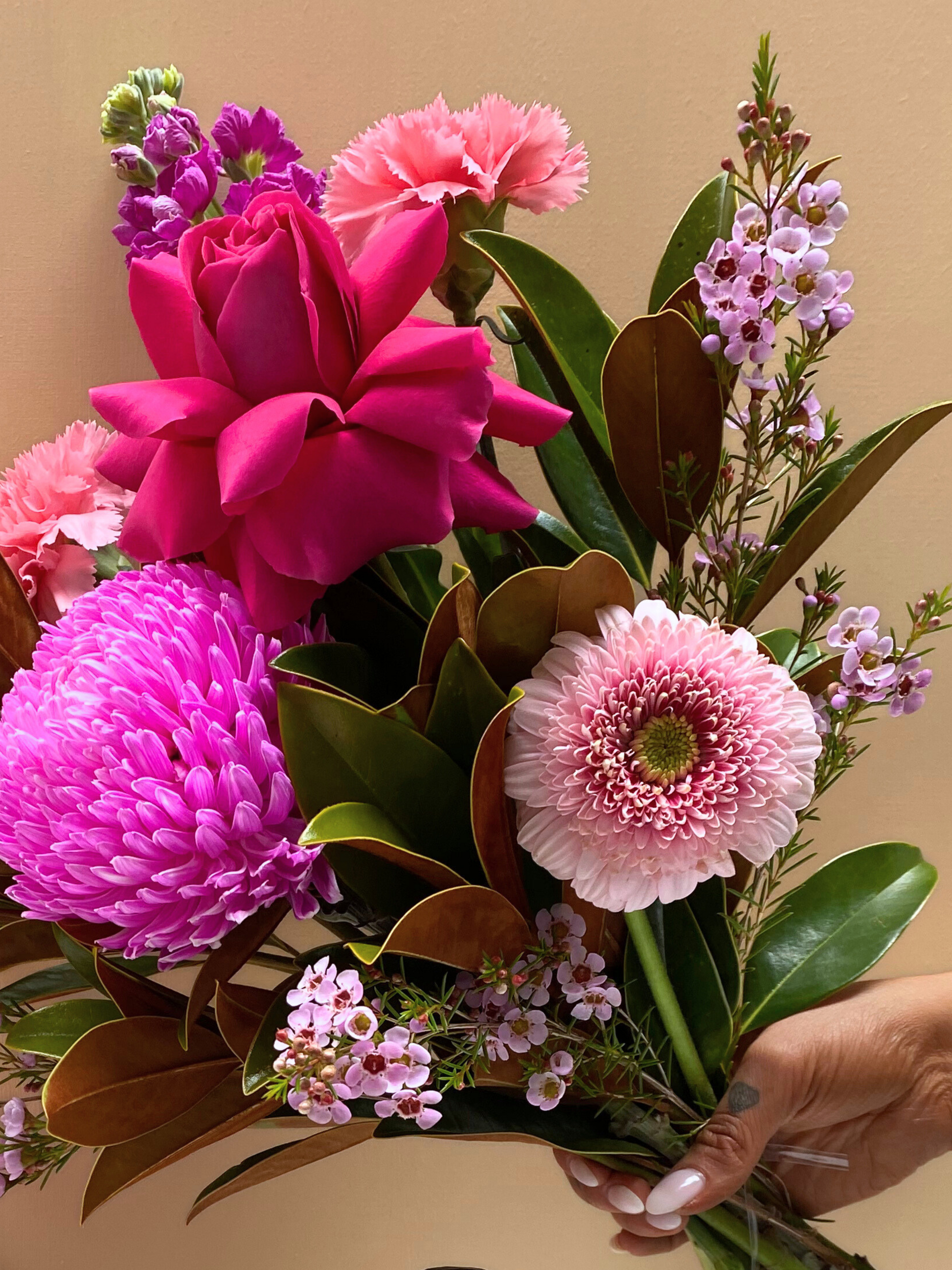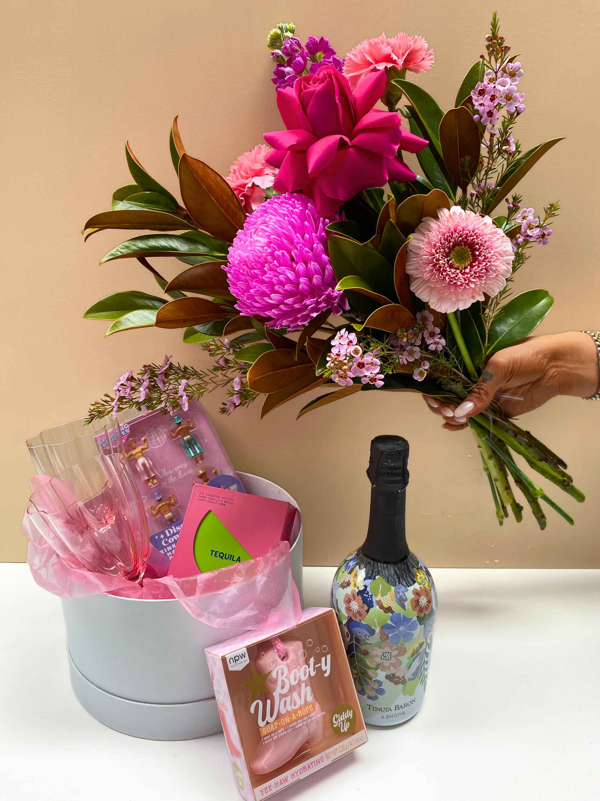 The Vegas Blvd Bundle is made for nights that sparkle. With pink & green tulip wine glasses, a cocktail recipe card kit, cheeky cowboy ‘booty wash’ soap on a rope, bare-bummed cowboy drink markers, Italian sparkling, and a bouquet of seasonal hot pink blooms — it’s bold, playful, and perfect for hens nights, girls’ trips, and every cheeky celebration