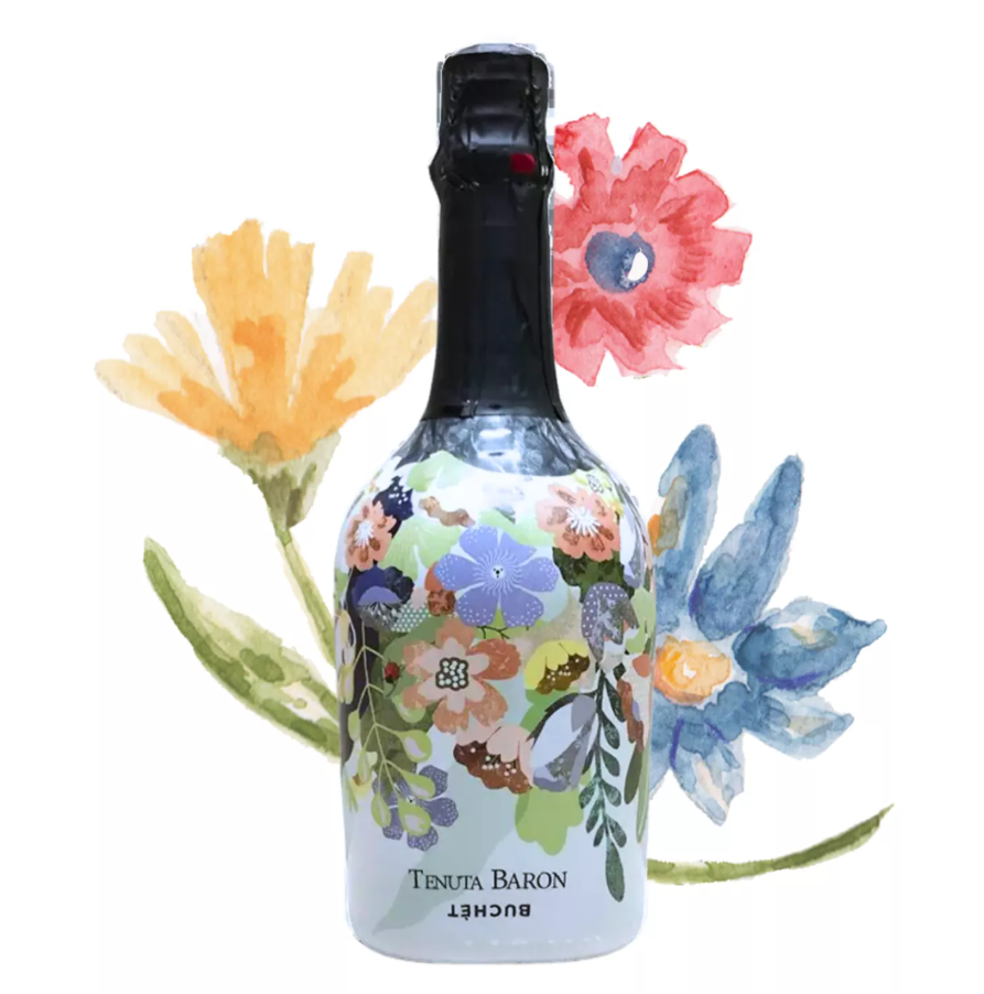 Hot pink blooms with a bottle of Italian sparkling — the perfect party pair.